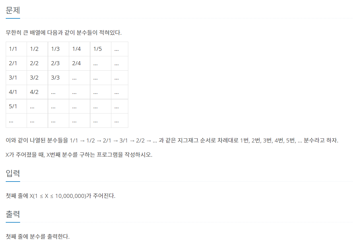 1일 1백준 3일차, 오늘 푼 문제는193번 문제인 "분수찾기"이다.