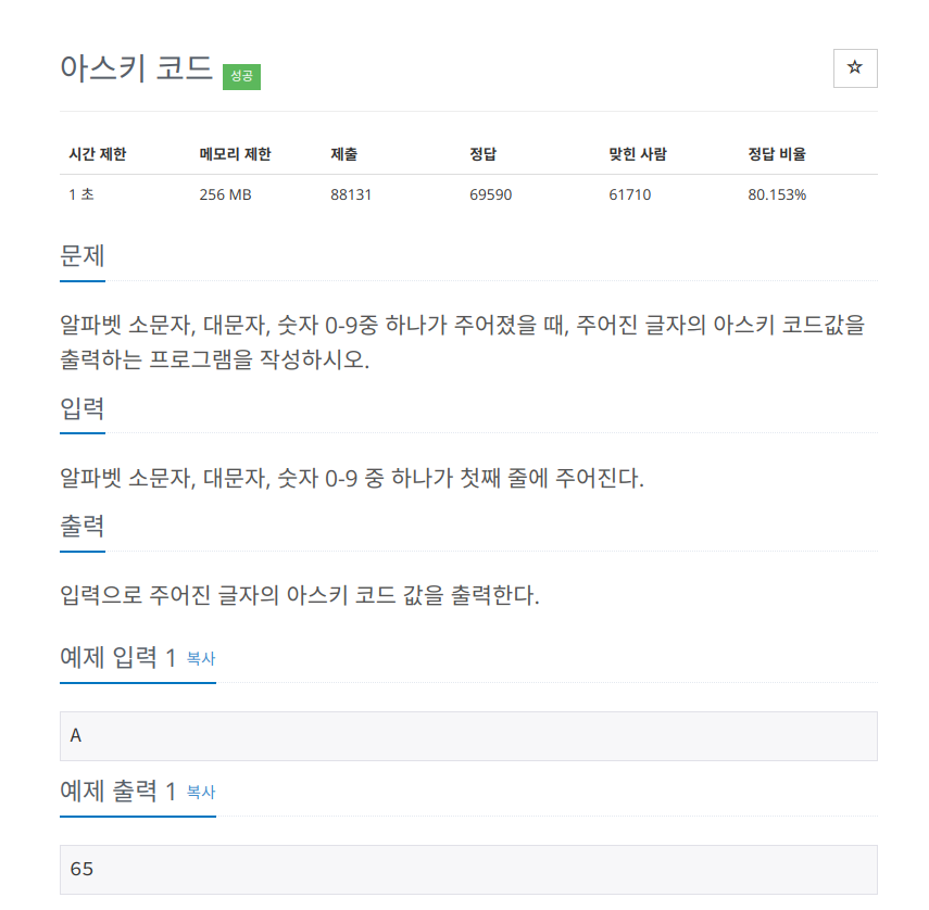 1일 1백준 3일차, 오늘 푼 문제는 11654번 문제인 "아스키 코드"이다.